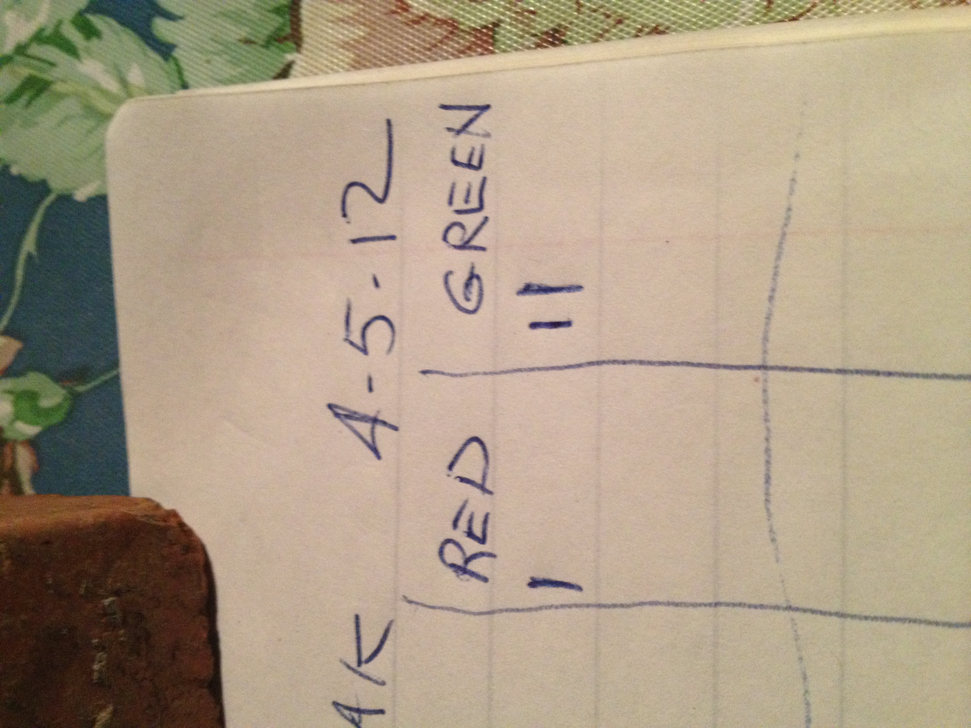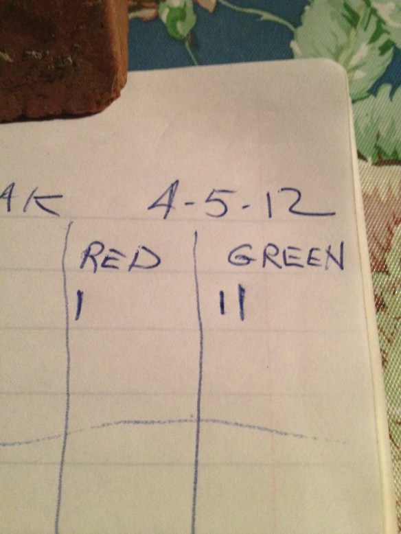 Last night at John’s was fun. We played a solid 3 games before the chilly night got to us. RvG 040512 = Red: 1 / Green: 2