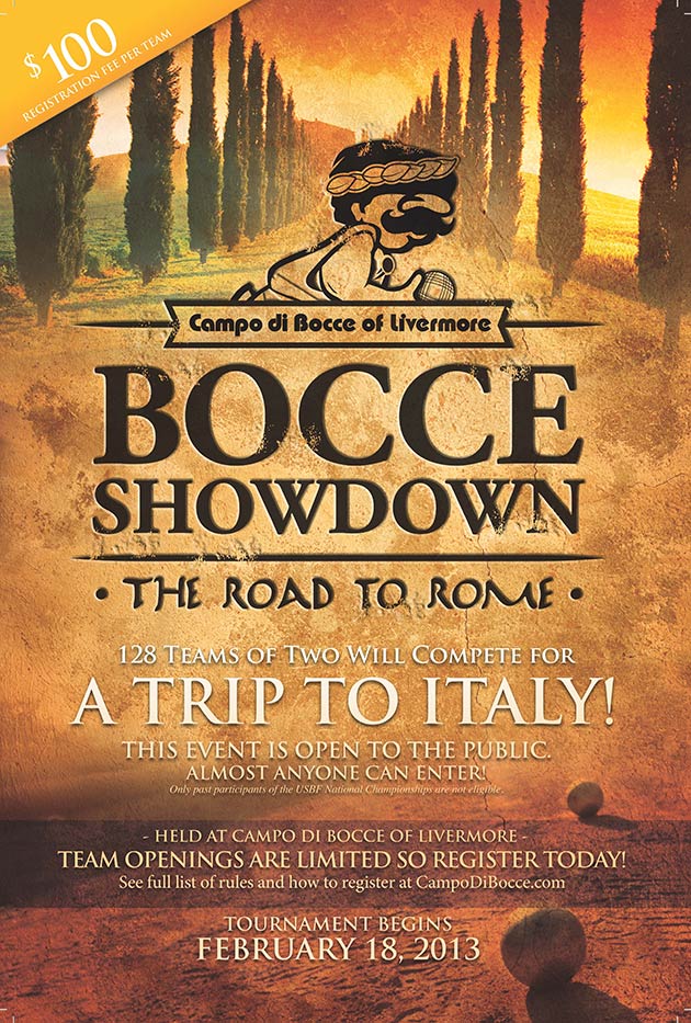 128 Teams of Two will compete starting Feb 18, 2013 at Campo di Bocce in Livermore. This event is open to the public and almost anyone can enter. They say ‘almost anyone’ because past participants of the USBF National Championships are not eligible. Which cuts out roughly half of our club. Although Rolando and John would look good riding around on some Vespas, Ben has asked those of us who are indeed eligible to join the fun as well as spread the word to your friends.